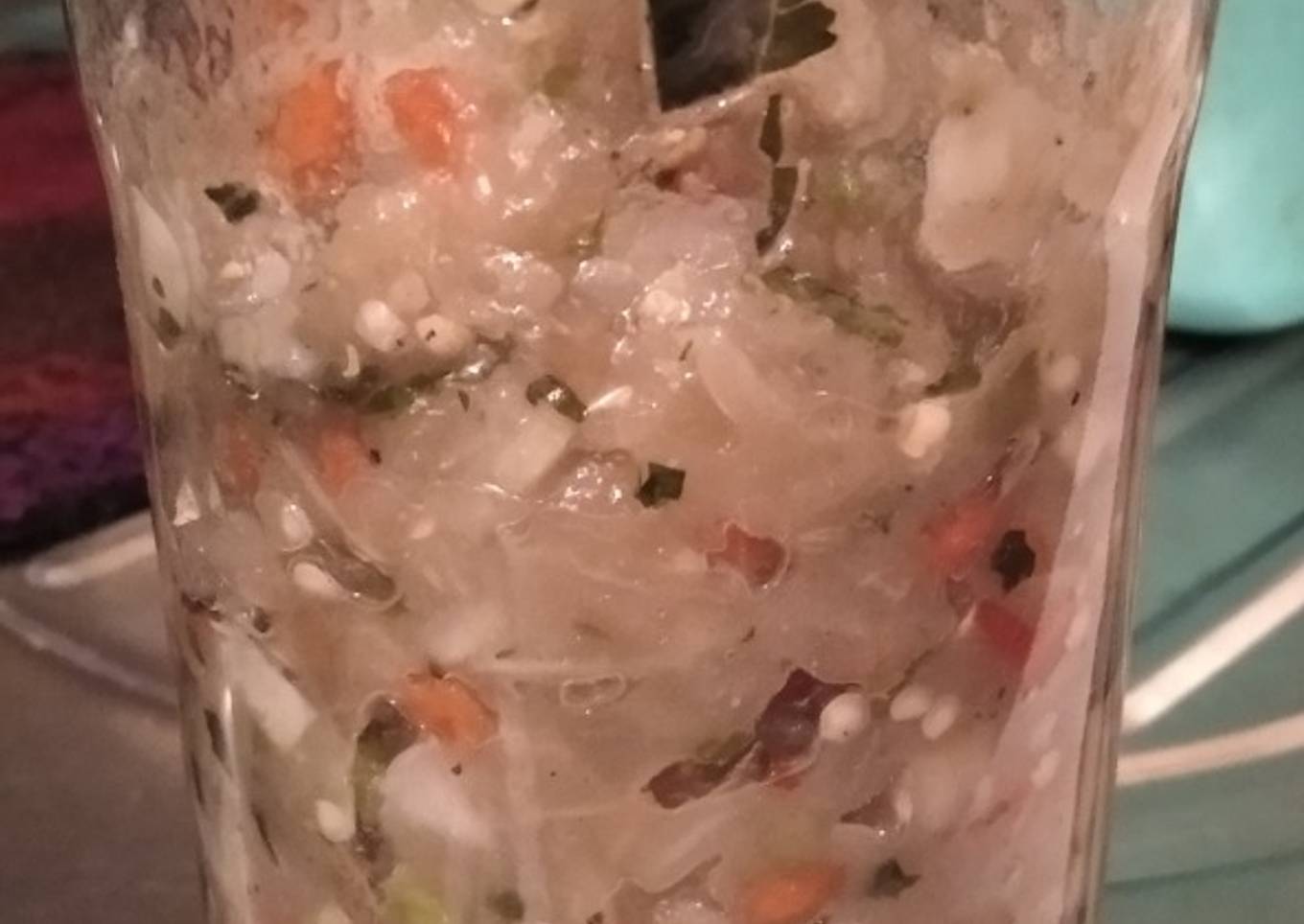 - Se pican en cubitos peque帽os la cebolla, el piment贸n, o los aj铆es. Se trituran los dientes de ajo y se corta muy bien el cilantro. Unimos todo, colocamos la sal, la pimienta, el aceite; probar y rectificar el punto de sal. Guardar en la nevera.
