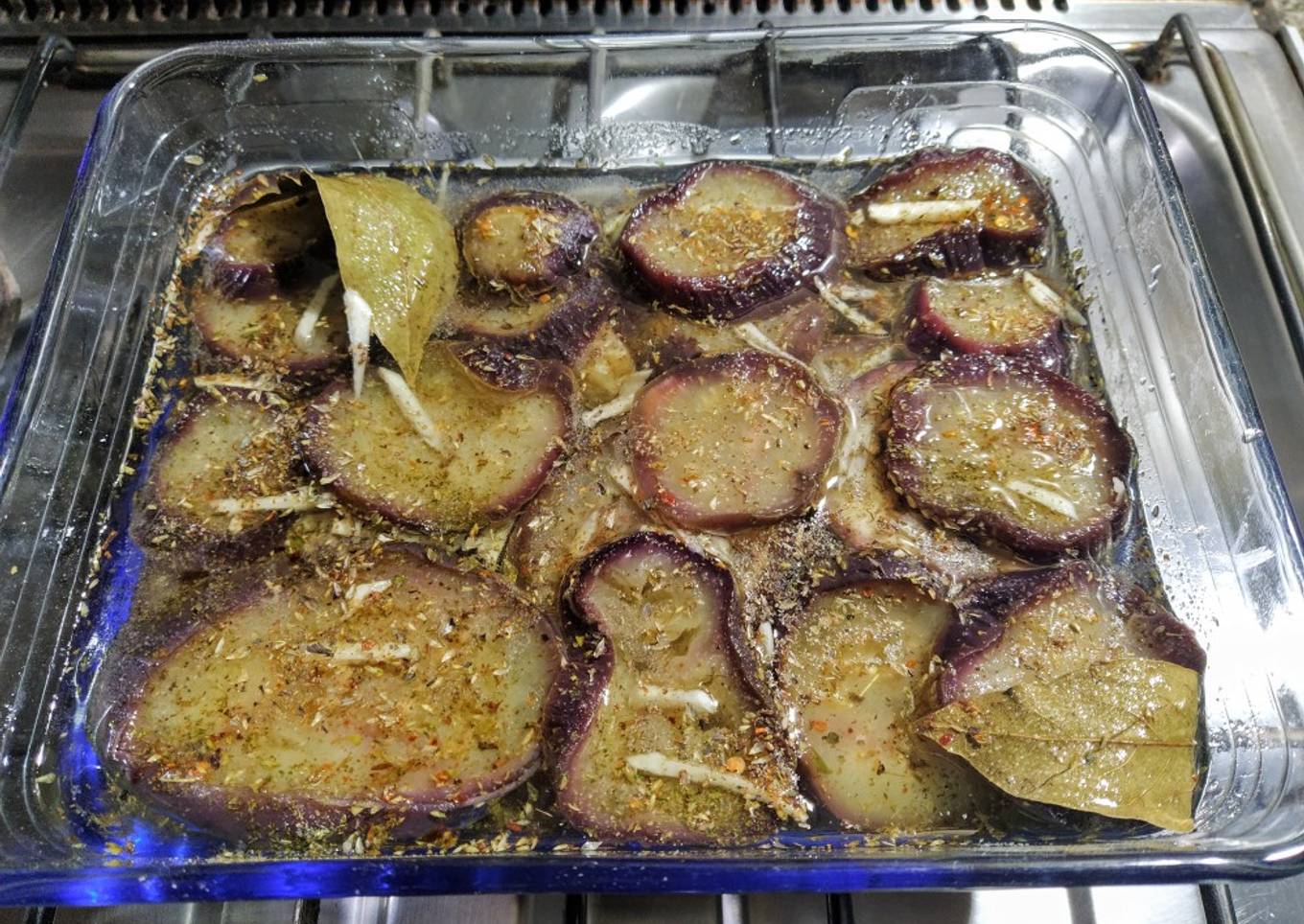 - En frasco de vidrio o en una fuente con tapa, cómo lo hice, acomodar en capas, berenjenas, láminas de ajo, condimentos, hojas de laurel, sal, hasta terminar con las berenjenas. Por arriba volcar el aceite, vinagre y un poco del agua de cocción. Más o menos, 2 tazas de aceite, 1/2 de vinagre y 1/4 de agua de la cocción. Tapar y dejar en la heladera toda la noche.