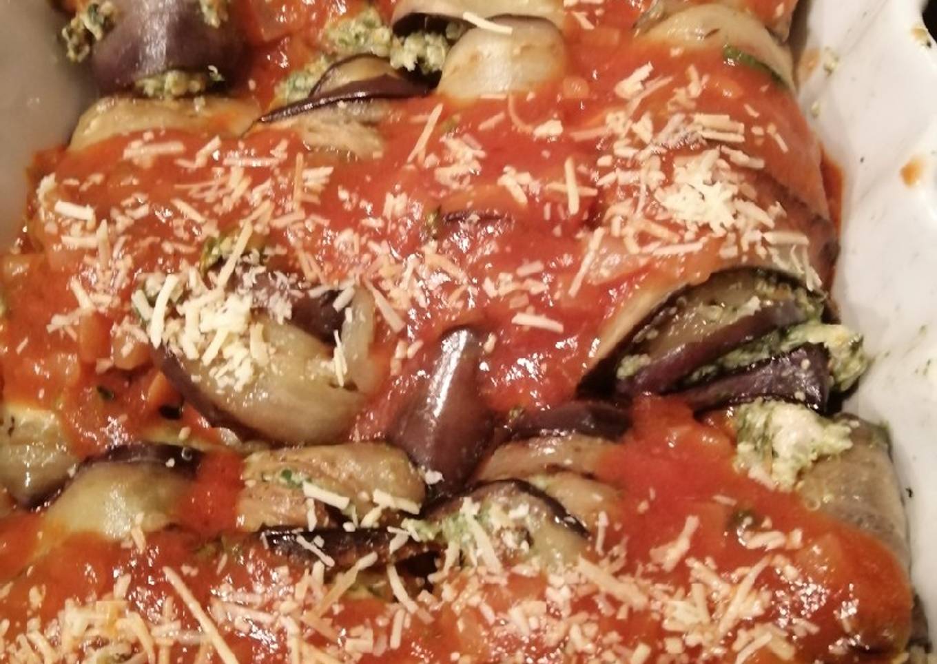 - Por otro lado cortar a lo largo las berenjenas bien finas y ponerlas a cocinar a la plancha o en un sartén con un poquitito de aceite, acomodar 3 rodajas de berenjenas medias juntas e ir colocando el relleno como si estuviéramos rellenando frilloas, ir colocándolas en una fuente de horno hasta terminarlas.