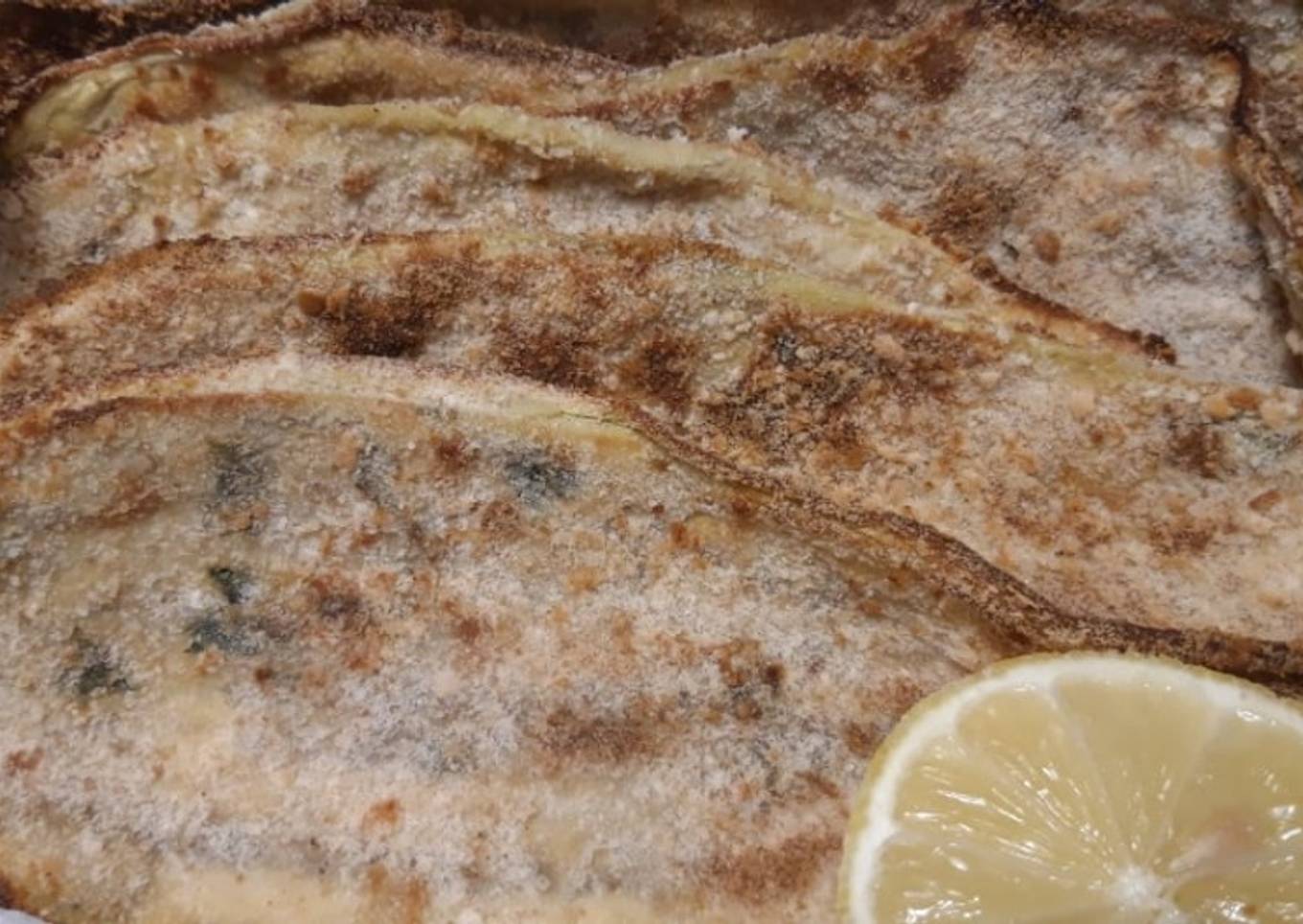 Las láminas son bien finas para que queden crocantes, también la cocción es fuerte y rápida para que no "desaparezca" la berenjena entre el apanado.