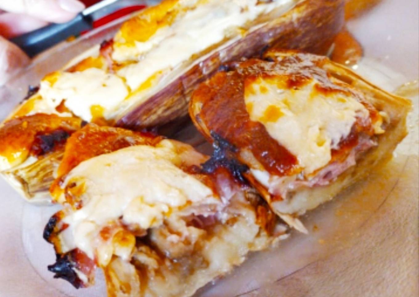 - Las rellenamos con cebolla rehogada, luego el jamón y arriba el queso. También se le puede poner un poquito de salsa!