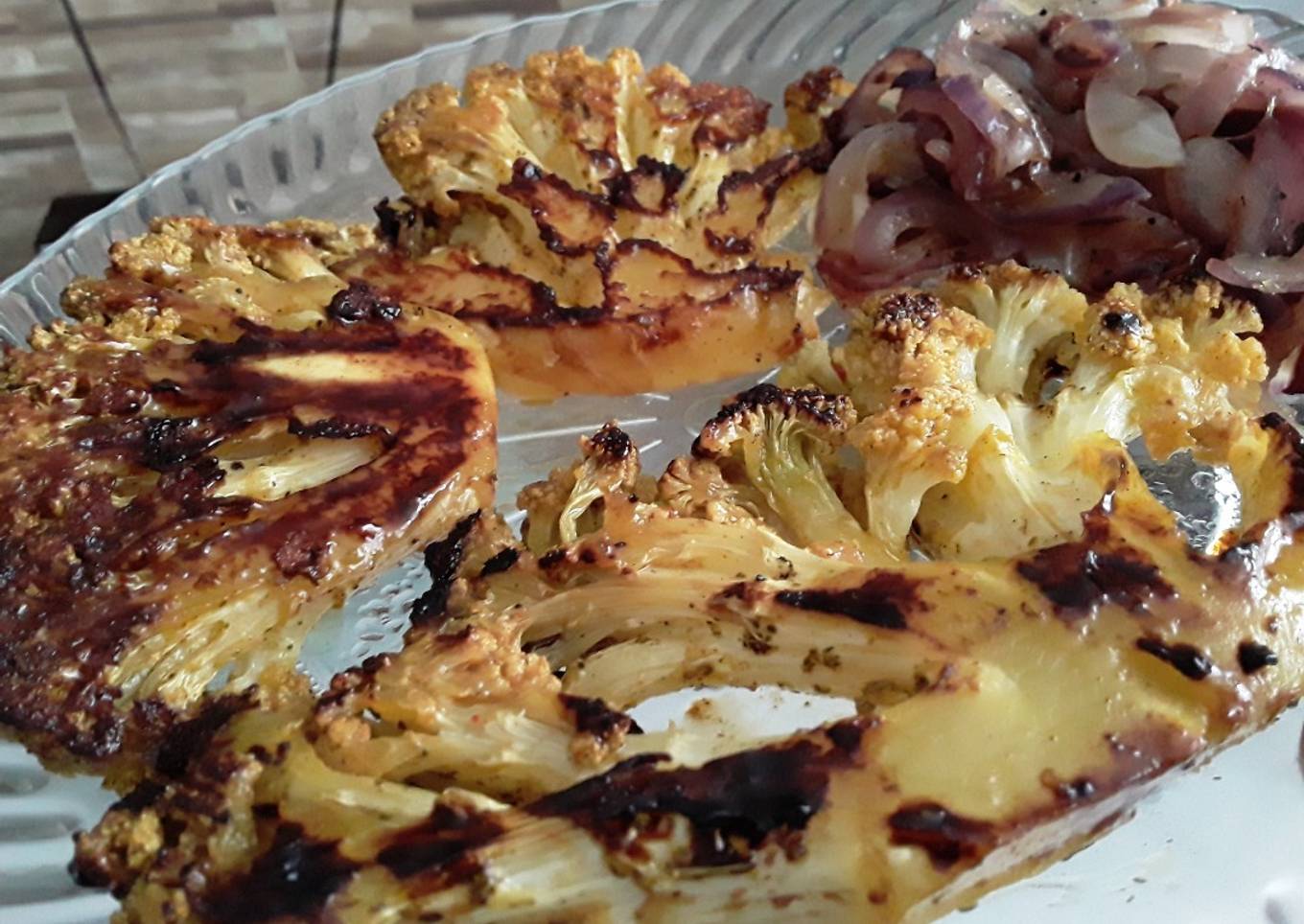 Son tajadas gruesas de coliflor asadas en la sartén con una rica mezcla de especias y aceite de oliva... además cebollas salteadas y un dip de berenjena, esta salsa si la tomé del recetario de @Icookeveryday123 ... para María Luisa mil gracias y no dejen de visitar su recetario, el cual tiene preparaciones de todo el mundo...