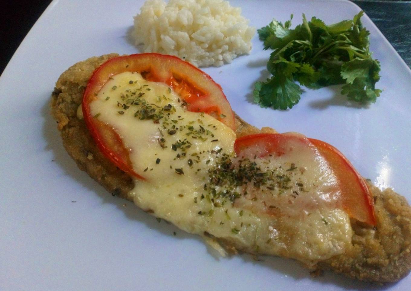 - Luego dar vuelta colocar las rodajas de 馃崊 queso 馃 y espolvorear or茅gano devuelta al horno 7 min aproximadamente o hasta gratinar el queso 馃, listo a disfrutar una ricas milanesas yo lo acompa帽茅 con arroz 馃尵 blanco 馃崥 y unas hojas de cilantro 馃尶