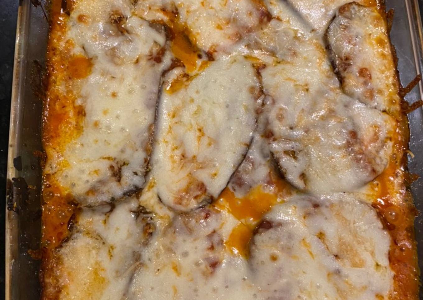 - Primero ponemos una capa de berenjenas, luego salsa de tomate para pizza, luego cubrimos con queso mozarrela, por último el queso parmesano y mezclado con pan rallado si decidiste ponerle.