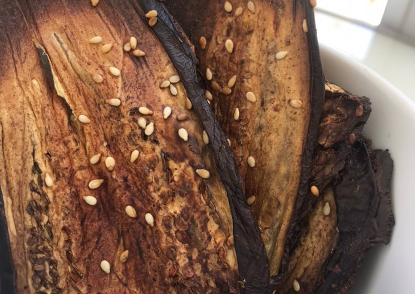 - La salsa de soya la mezclas con la maicena y el sésamo y pintas cada rebanada de berenjena dispuesta en la lata del horno. Hornear por 20 min a 180 grados Celsius.