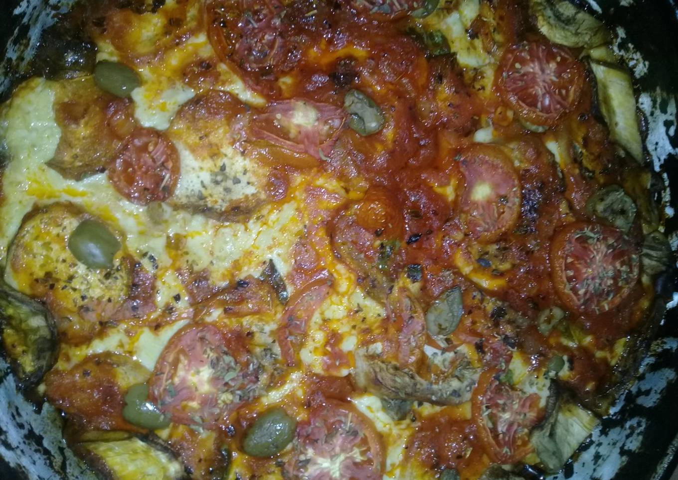 - Poner una capa de salsa, las aceitunas, el tomate cortado en rodajas, mandar al horno por 45 minutos y listo.