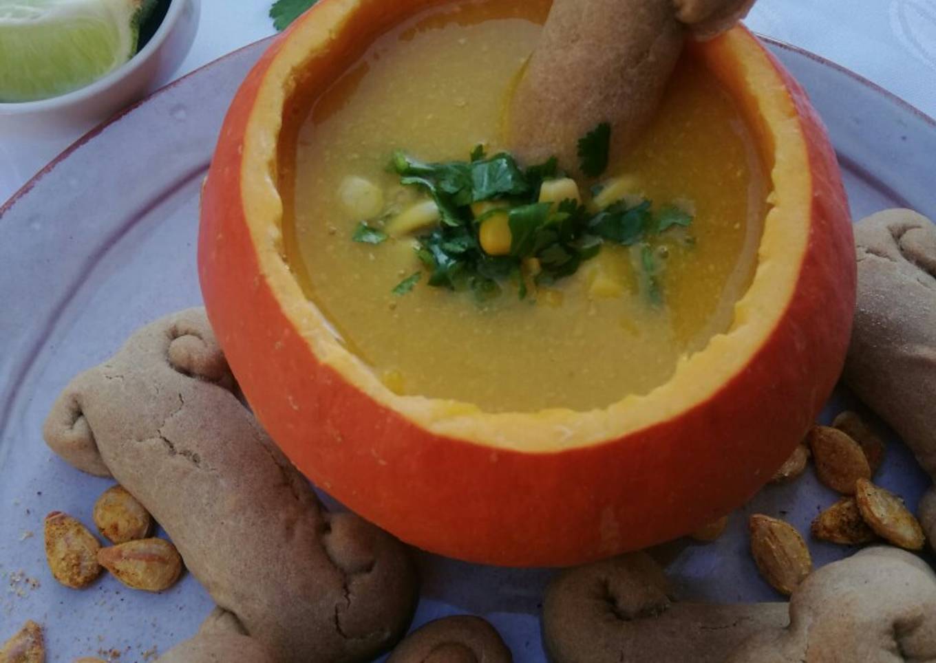 - Servir la sopa dentro de la calabaza. Aparte servir los huesos de mastodonte y la mezcla de maíz con cilantro para que cada comensal se eche a gusto de cada uno.