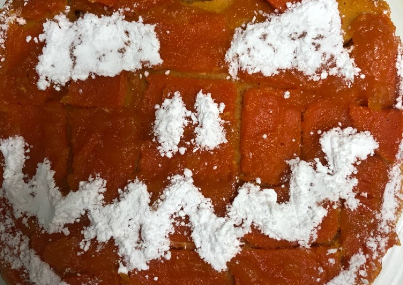 - Cortamos a finas lonchas la calabaza reservada. La ponemos encima de la base. En un bol ponemos mermelada de calabaza (3 cucharadas) y la mezclamos con un poco de agua. Pintamos las cintas de calabaza y lo ponemos todo otra vez al horno pero para gratinar. Cuando este tostado lo sacamos del horno. Lo servimos frío, desmoldado. Que aproveche!!!!