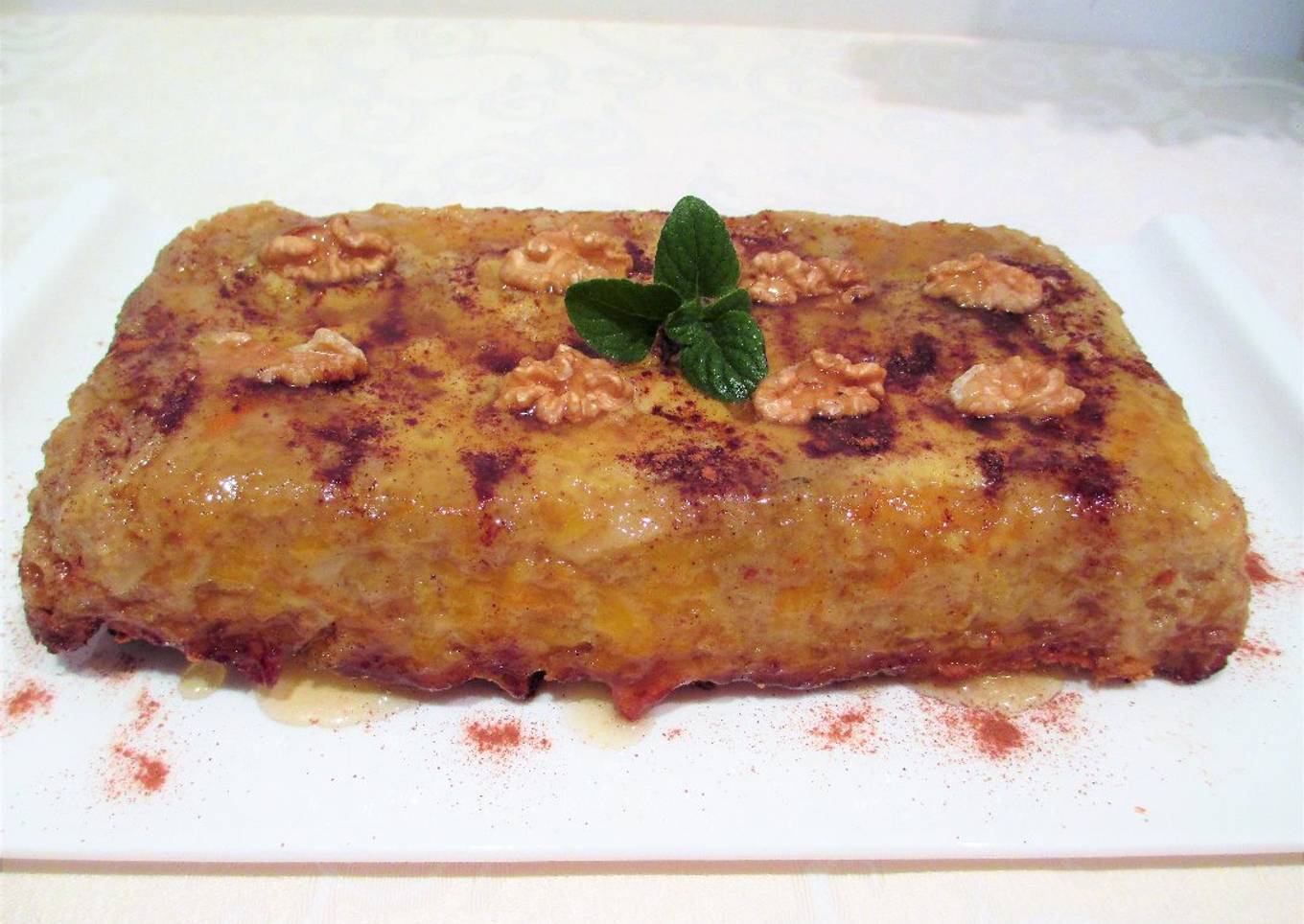 - Saca del horno y deja el pudín entibiar. Dale la vuelta en el plato para servir. Espolvorea canela molida y adorna con las nueces y una ramita de menta. Riega con la miel y listo para servir.